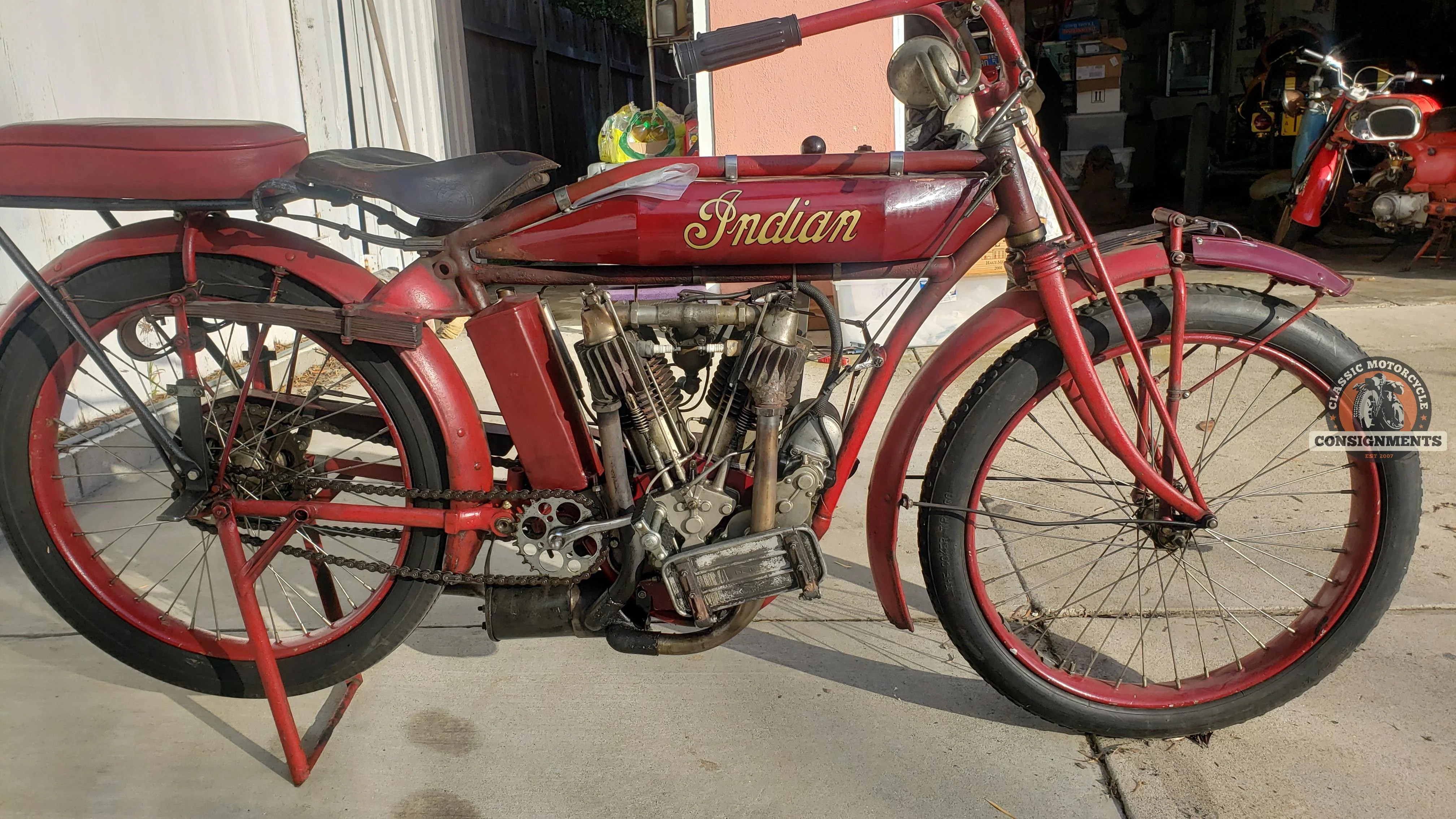 Description: This is a 1913 Indian Motorcycle, twin cylinder 1000 cc motorcycle. This is the first year that Indian made a specific model run that could be ordered as is or accessorized. Therefore, this model is the Standard Twin. This particular motorcycle was purchased as a basket case in Hershey PN in 1980. The bike came from The Boston area. It took a few years to get it sorted out and running and it has become a great runner. Current owner has put over 10,000 miles on it completing many pre-16 Minden rides and many AMCA rides on the west coast. Last engine rebuild was by Johnny Eagles in 2001. This bike has mostly original 1913 parts and it has seen partial restoration a few times so mis-match paint on top of the original, The bike is a good runner and has been used two-up many times, note the custom seat pad and foot pegs! It is a handful to ride and great fun!