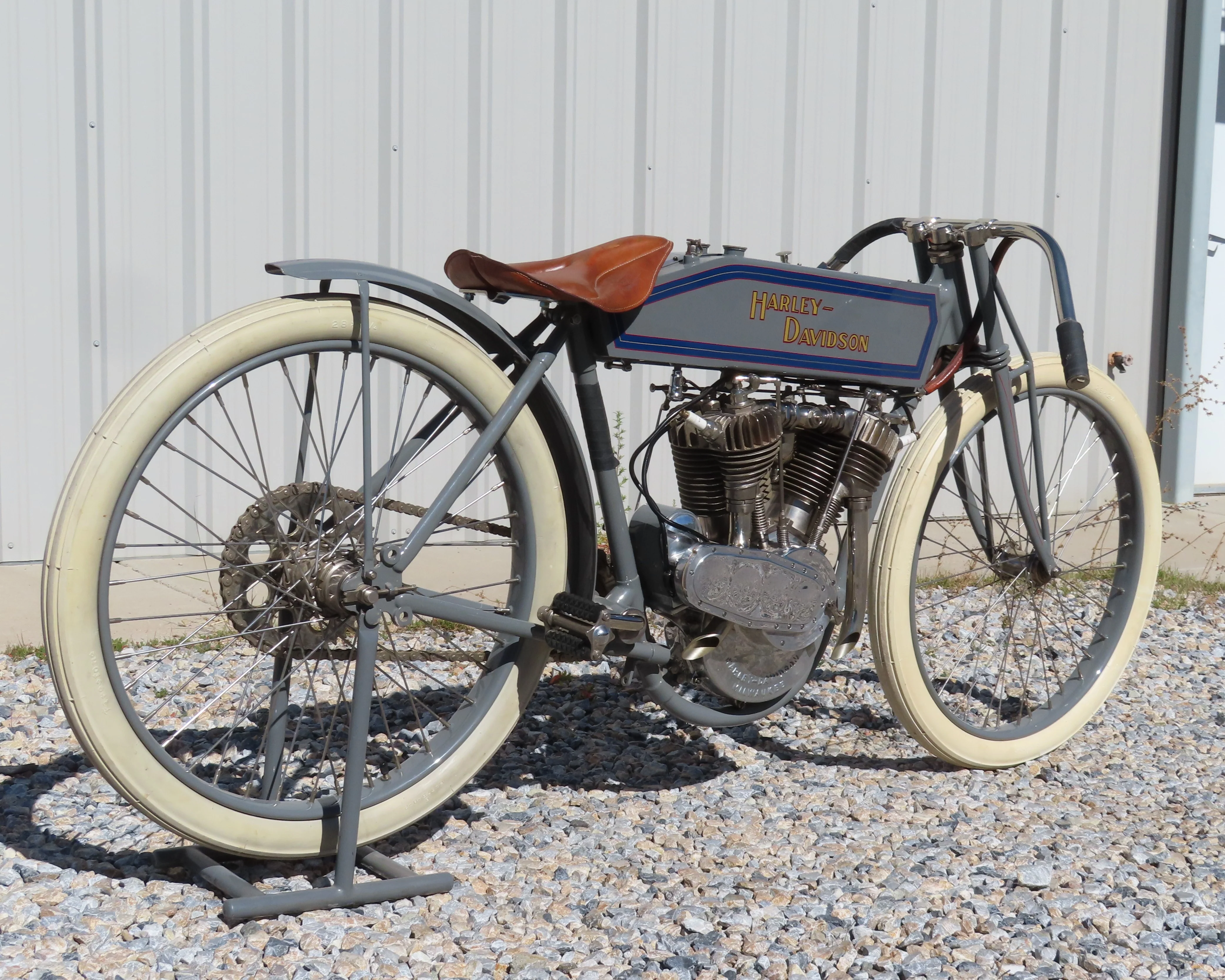 In late 1914, Harley-Davidson officially entered professional competition, fielding purpose-built racers similar in layout and engineering to the machine offered here. Riders such as Leslie Parkhurst, Joe Wolters, and Otto Walker became early racing icons, piloting stripped-down machines engineered purely for speed.