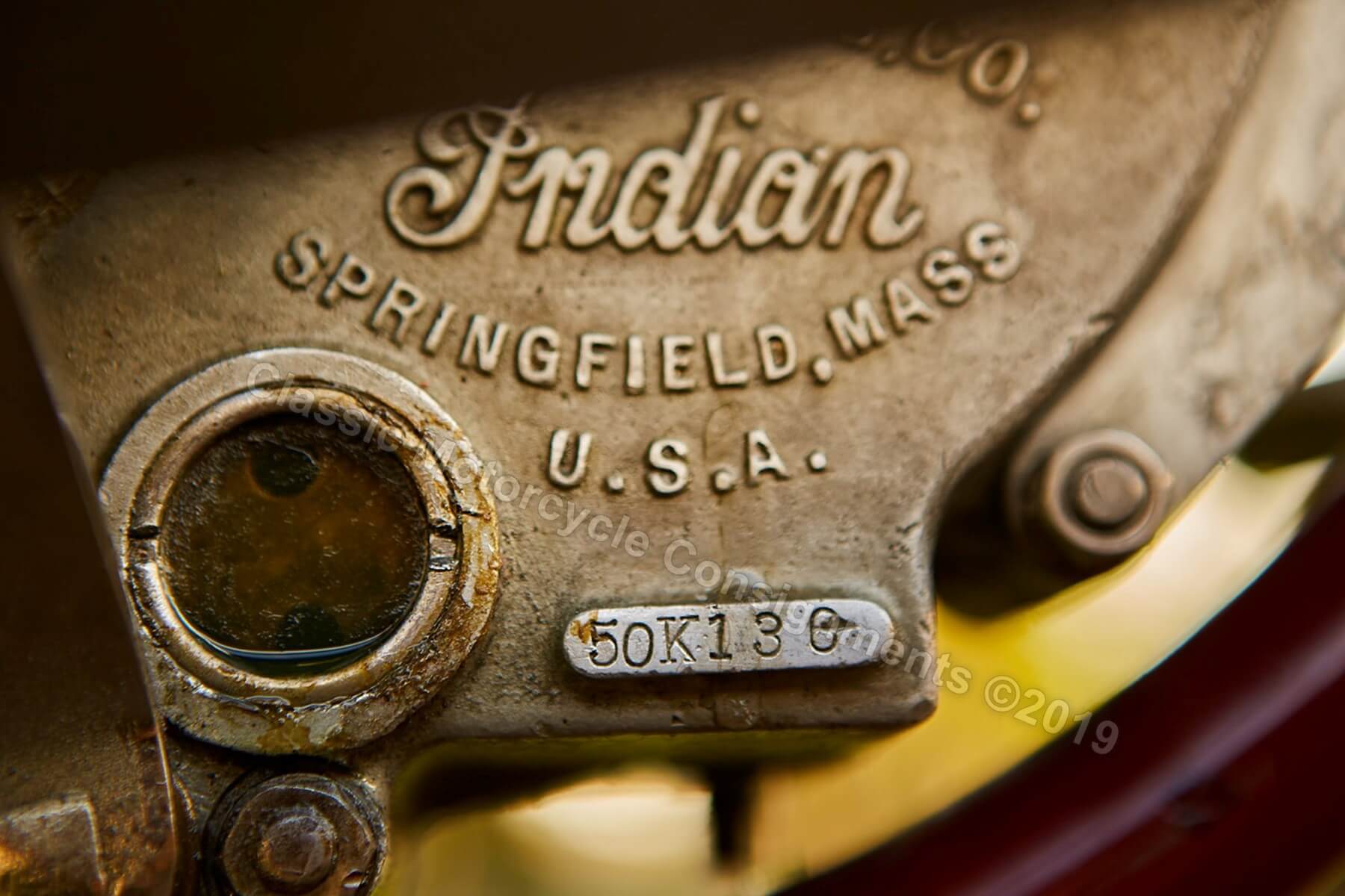 Antique Motorcycle Works restored the frame and provided many of the hard-to-find parts needed to bring the bike back to life. The engine, transmission and magneto were rebuilt by Johnny Eagles of Orange, CA, who also fitted the drive gear, which includes a NOS Powerplus clutch and a ¾ inch Schebler carburetor, Paint is by Jimmy Rader of Bradley, CA. The wheel rims are replacements of the original 27” x 2-1/2” racing rims used by Indian during this period. It uses the original oil bag and Bates seat frame, both restored by Jethro Smith. Braking is provided by an inner expanding drum and exterior band brake at the rear wheel. The sale will include the original fuel tank and handlebars.